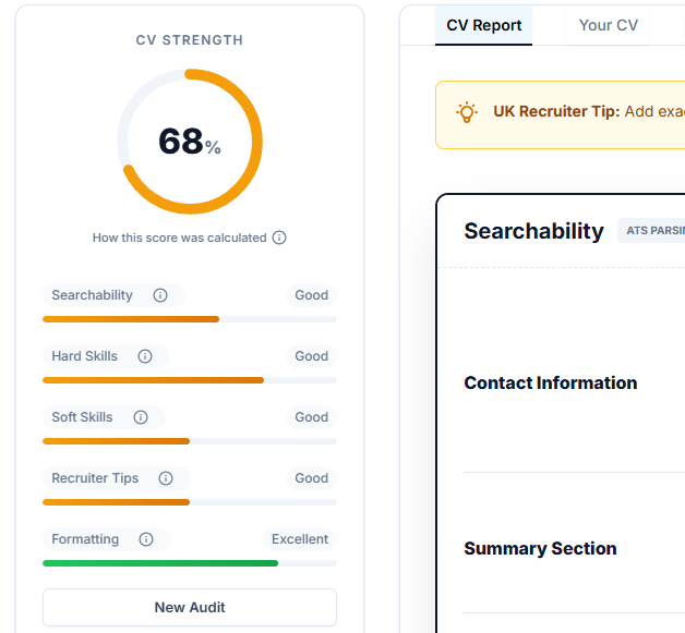 We scan your CV against real UK/EU job descriptions and tell you: